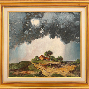 Between about 1915 and 1920, Marc-Aurèle Fortin demonstrated a fascination with the dramatic lighting effects produced by brooding summer skies. In 1919, he exhibited the work, After the Storm (Saint Sulpice Library, no. 4), which was described by a critic as depicting, “an apocalyptic sky, an end-of-the-world sky, with stupendous, terrifying clouds…Here the artist shows us the blind forces of nature, the forces that dominate and crush the barely visible speck that is man” [1]. While the reviewer refers to that painting as a canvas, and ours is painted on board, it could easily describe our After the Storm (Fig. 1), just as it could describe a canvas in the collection of Power Corporation of Canada. Throughout his career, Fortin would use his artistic powers to contrast humanity and nature, with cities, towns and buildings often dominated by comparatively massive natural elements such as trees, clouds and mountains. Fortin’s use of proportion often reveals his focus. He was among those Quebec artists (see, notably, Adrien Hebert) influenced by impressionism, and simultaneously fascinated with urban growth in rapidly industrializing North America.