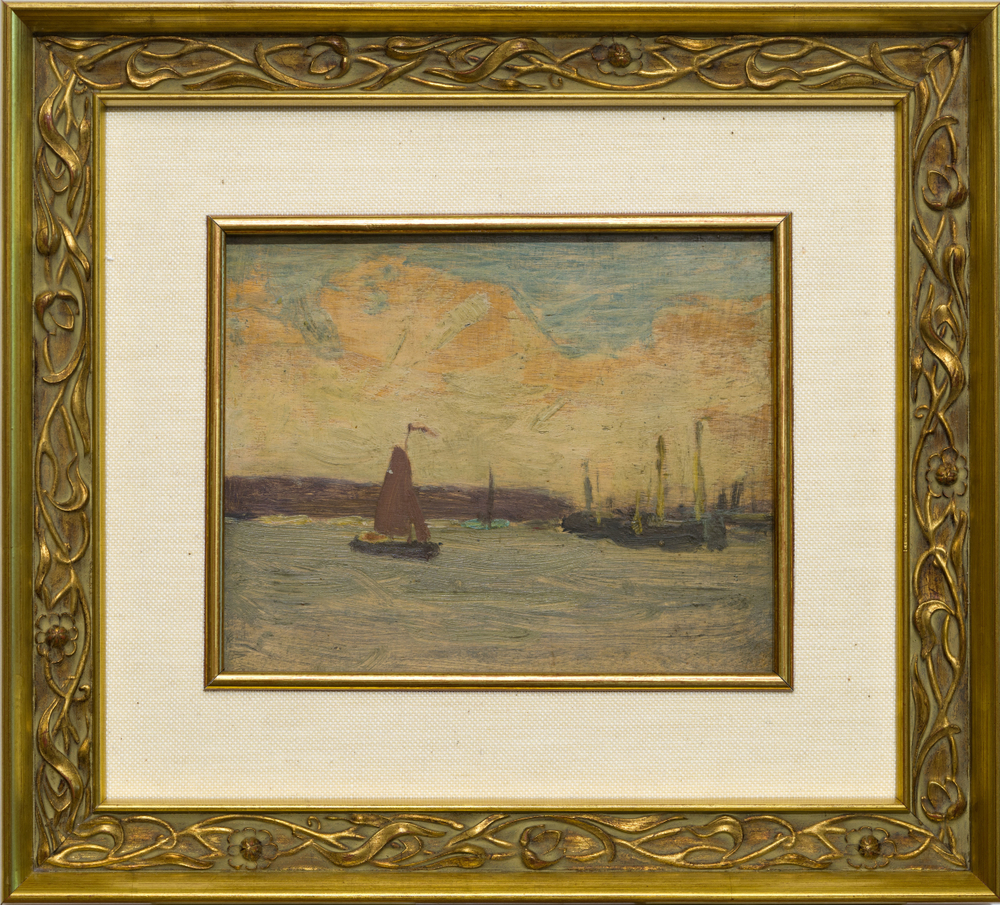 This exquisite work by James Wilson Morrice says a great deal about Canada’s finest artist. The scene is created largely with differential tones, the texture of the brushwork, limited paint, and confident use of the panel itself. Morrice had remarkable abilities to capture a feeling of a moment, and express a lot with very little. Compositionally, Near Dordrecht is disproportionately water and sky, with the human and land elements occupying relatively little space. It is fair to say that it shares qualities with some of the landscapes by Whistler.