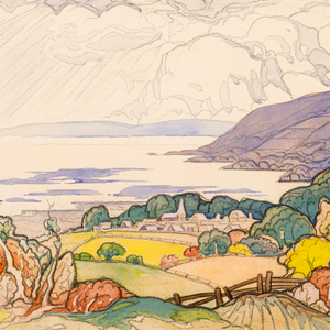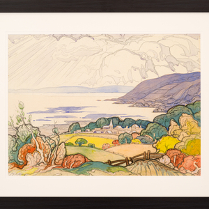 Galerie d'art La Corniche, ChicoutimiThis luminous watercolour reflects Marc-Aurèle Fortin’s celebrated engagement with the Charlevoix region and the lower St. Lawrence River. He achieves a modern, radiant vision of rural Quebec, balancing structure, atmosphere, and with luminous economy.