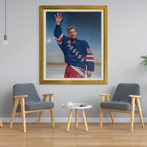 Danby reached out to Wayne and his agent, both of whom were enthusiastic about the project. Over several months, he studied photographs from the game and met with Wayne for head studies, ultimately selecting the perfect pose. Danby even used a computer program to recreate the night sky over Madison Square Garden, aligning it with the exact moment of Gretzky’s farewell. "The positioning of the planets and stars were so appropriate, it was as if they were predetermined," he writes in his manuscript.[1]