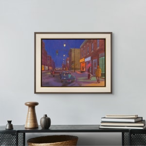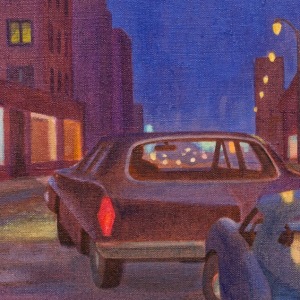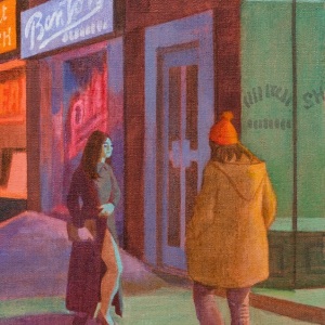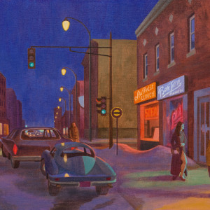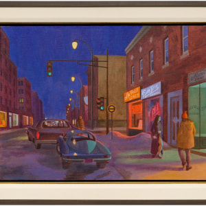 “The city is his place. Night is his time, and the overwhelming solitude of man his theme... Apprehension and fear lurk in the threatening shadows, but the greatest terror is loneliness.” [2] Robert Ayre wrote about Philip Surrey. The notions of “fear” and “apprehension” and other tensions are expressed in many ways in his paintings. Certainly, there is a tension in the relationship of the leggy maxi-coated young lady with the red tuqued fellow seen only from the back.