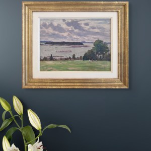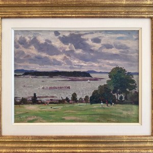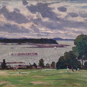 This is executed with the vitality of a plein air composition, that is with the scene directly in front of him, on the spot as Robert Pilot applied paint to the panel. The composition is of golfers on the rolling turf of the Algonquin Golf Course at Saint Andrews, New Brunswick, a log boom in Passamaquoddy Bay, an inlet of the Bay of Fundy, and a view beyond to Navy Island with the Maine shore in the distance. Beyond the course, the painting is predominantly in a palette of cool mauves and greys, and an atmosphere that is consistent with the light also in many of Pilot’s Quebec City paintings.