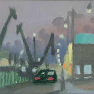 Philip Surrey is one of Canada’s most important post World War ll figurative artists. He is an artist worthy of study in the company of Alex Colville and Jean Paul Lemieux . This pair of paintings is inspired by the construction of the Decarie Expressway, likely at the access ramp at Sherbrooke Street, a 10 minute walk west of his home. Creatively, we know of Surrey’s laborious evolution of his paintings, often resolving compositions over numerous stages, including drawings, watercolours, and oil paint, often in various sizes. Although almost identical in composition, these Decarie paintings demonstrate his experiments with different but consistently artificial and electric light to create a mood. The cranes, painted loosely with mechanical and monstrous arms, serve to create a beastly presence, even hammerlike in their depiction. The paintings are indicative of the artist’s psychological preoccupation and resentment of cars, a seemingly exponential growth of vehicle traffic in the Post WW ll era and the threat in Surrey’s mind they posed.