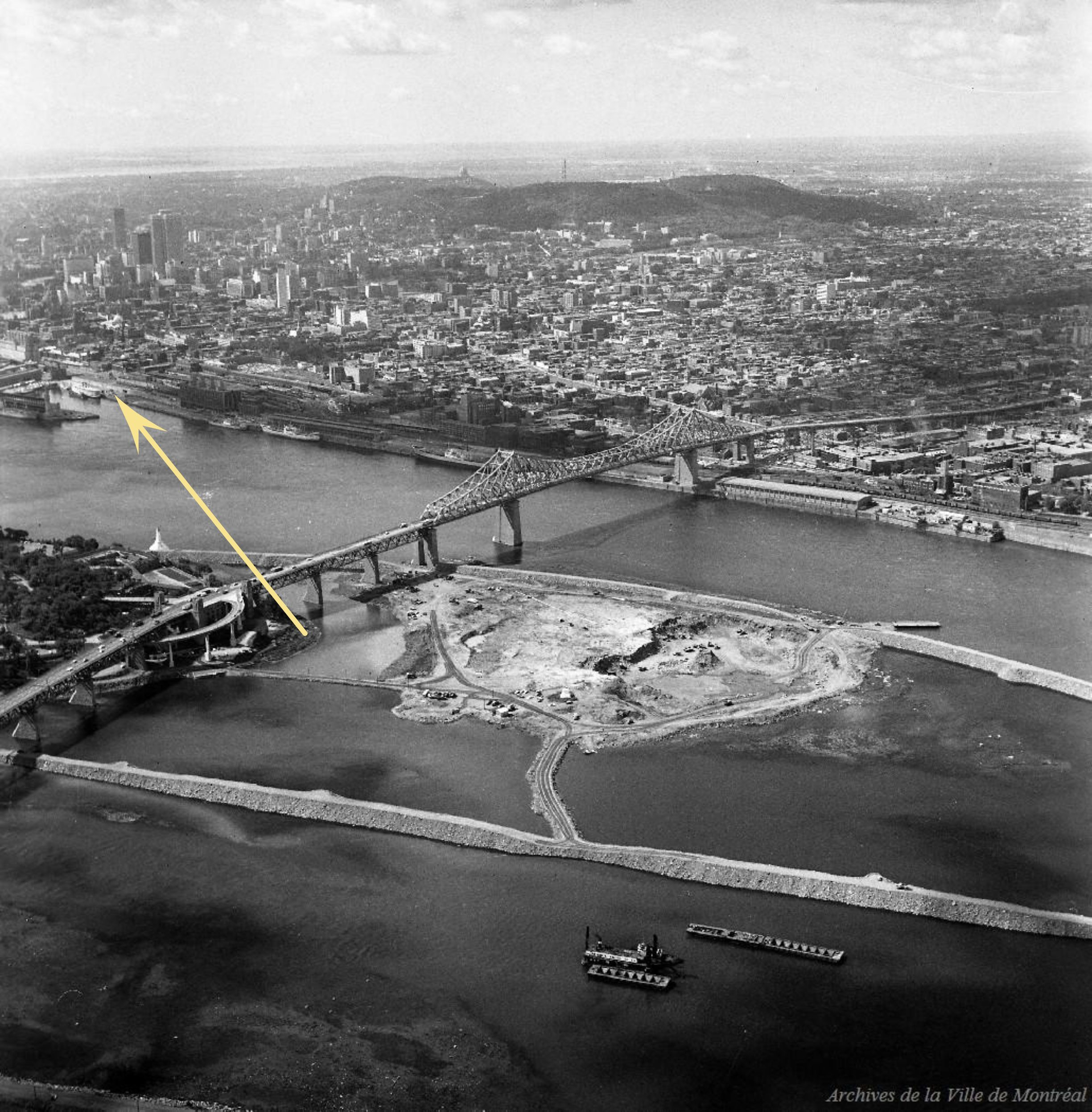 Aerial view of Île Ronde in 1964 while it is in the process of being subsumed in the expansion of Île Ste. Hélène. The arrow depicts our estimation of Raphael’s approximate view point in 1883. (Archives de Montreal)