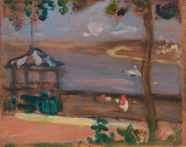 In Paris, in the Spring of 1911, Morrice exhibited a large canvas ( private collection ) based on this sketch; two years later, this canvas was shown in the Secession exhibition in Rome, sharing a wall with Renoir and Matisse, among others. Last summer, it was part of the "Expanding Horizons" exhibition at the Montreal Museum of Fine Arts. The composition is the same, except that the water is now bright blue and white, and the little daubs of colour have been transformed into a dozen tiny figures and a smoking steamship.