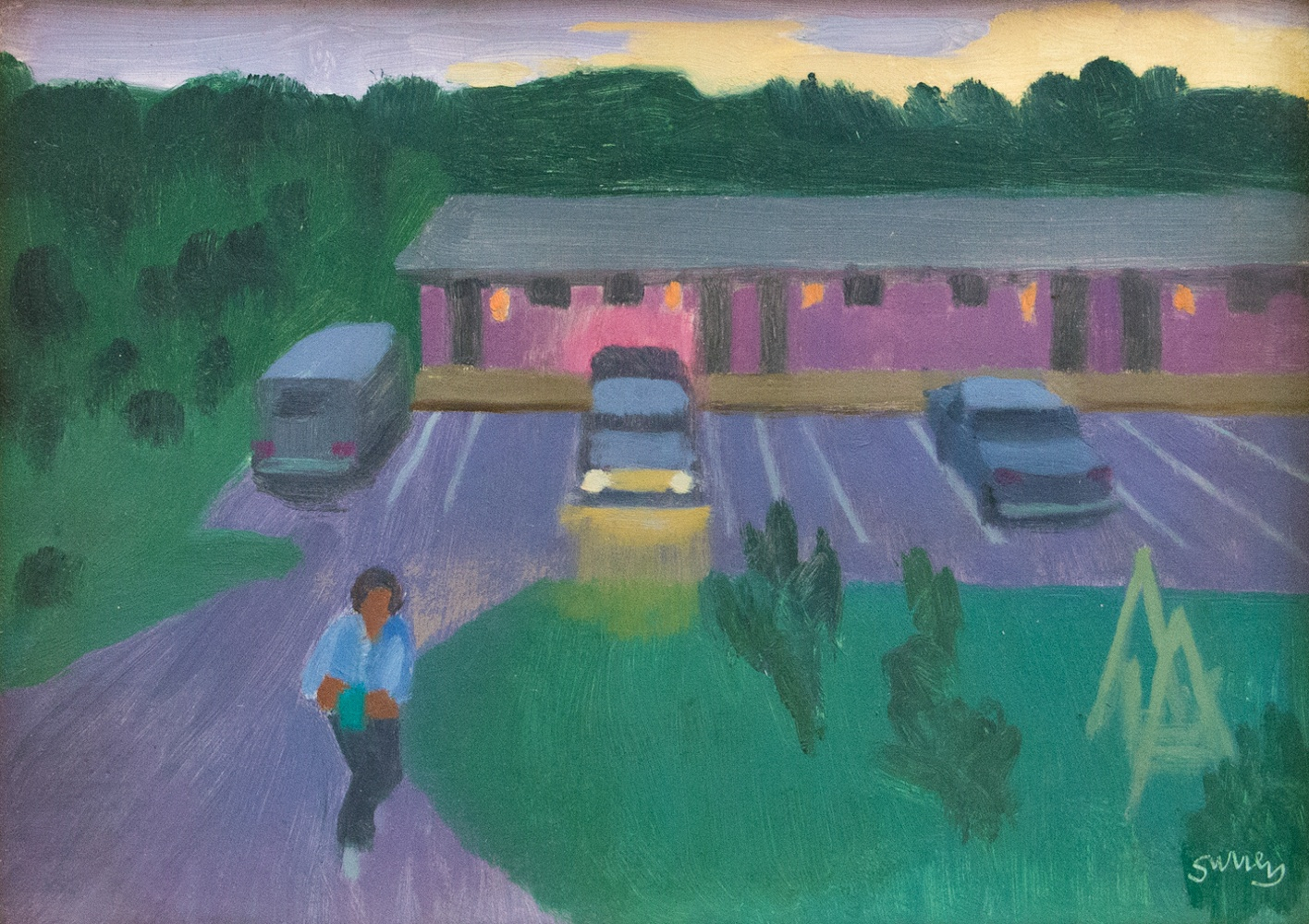 La composition en apparence inoffensive d’un motel et d’une voiture qui arrive dans l’aire de stationnement à la brunante avec quelqu’un qui marche devant la machine à glace invitent à toutes sortes de suppositions quant à ce qui pourrait survenir par la suite.