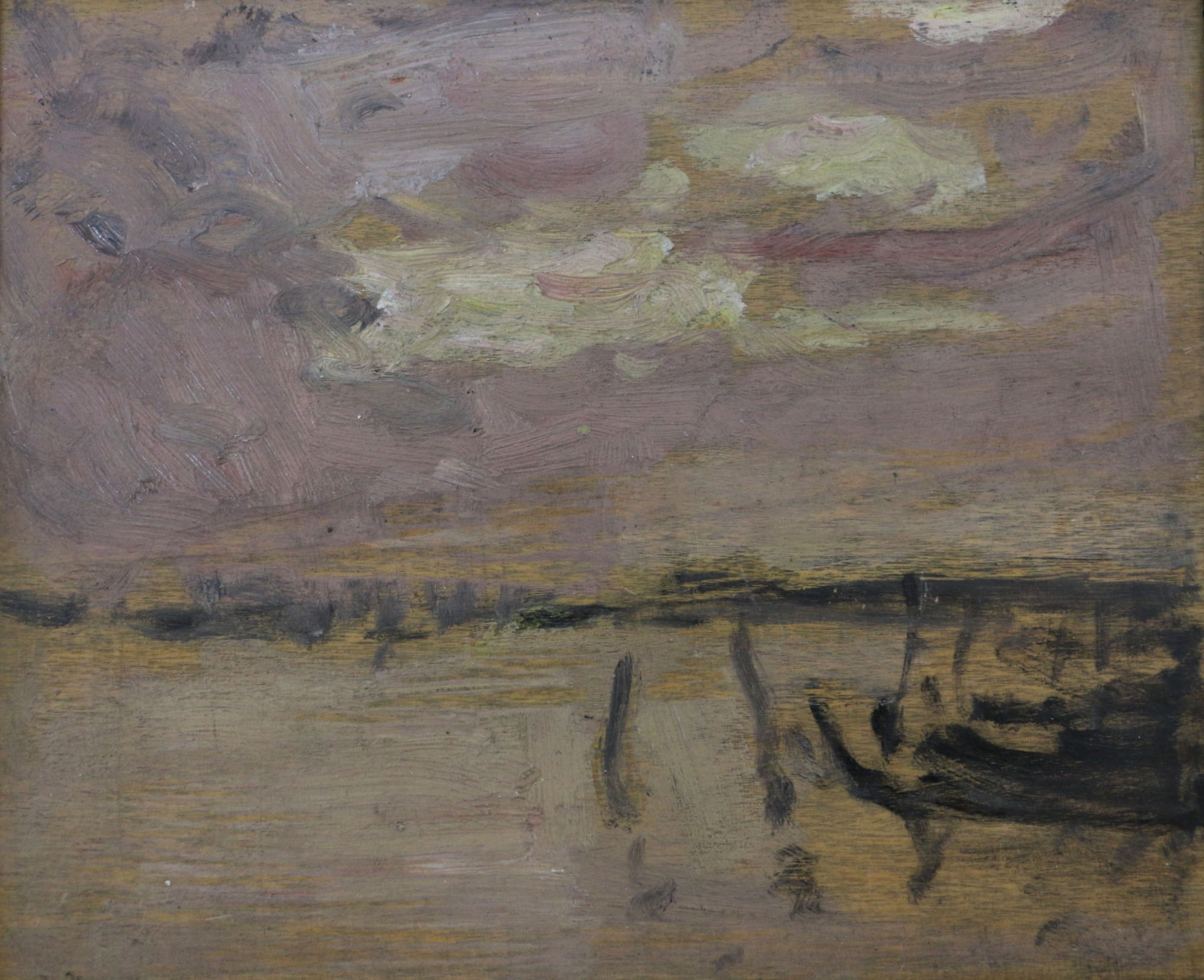 When she sent me a small, black and white image of that painting, my art historian friend enumerated the colors, then added "Very delicious", two words, for a little panel that mainly depicts two things... the sky, the water; then we find the "land" on the horizon and, closer to us, flat boats and mooring posts. An inclined one sends our eye back to the mauve sky with its heavy clouds. If we look long enough, the moon appears timidly between the two whiter clouds, just after the sun has set. Note how the artist has used the natural lines of his wood panel to give us a sense of the breeze; he cleverly played on the thickess of his paint to accentuate the clouds at the center or, on the other hand, on its thinness to simulate the evening wind over the nearly still water.