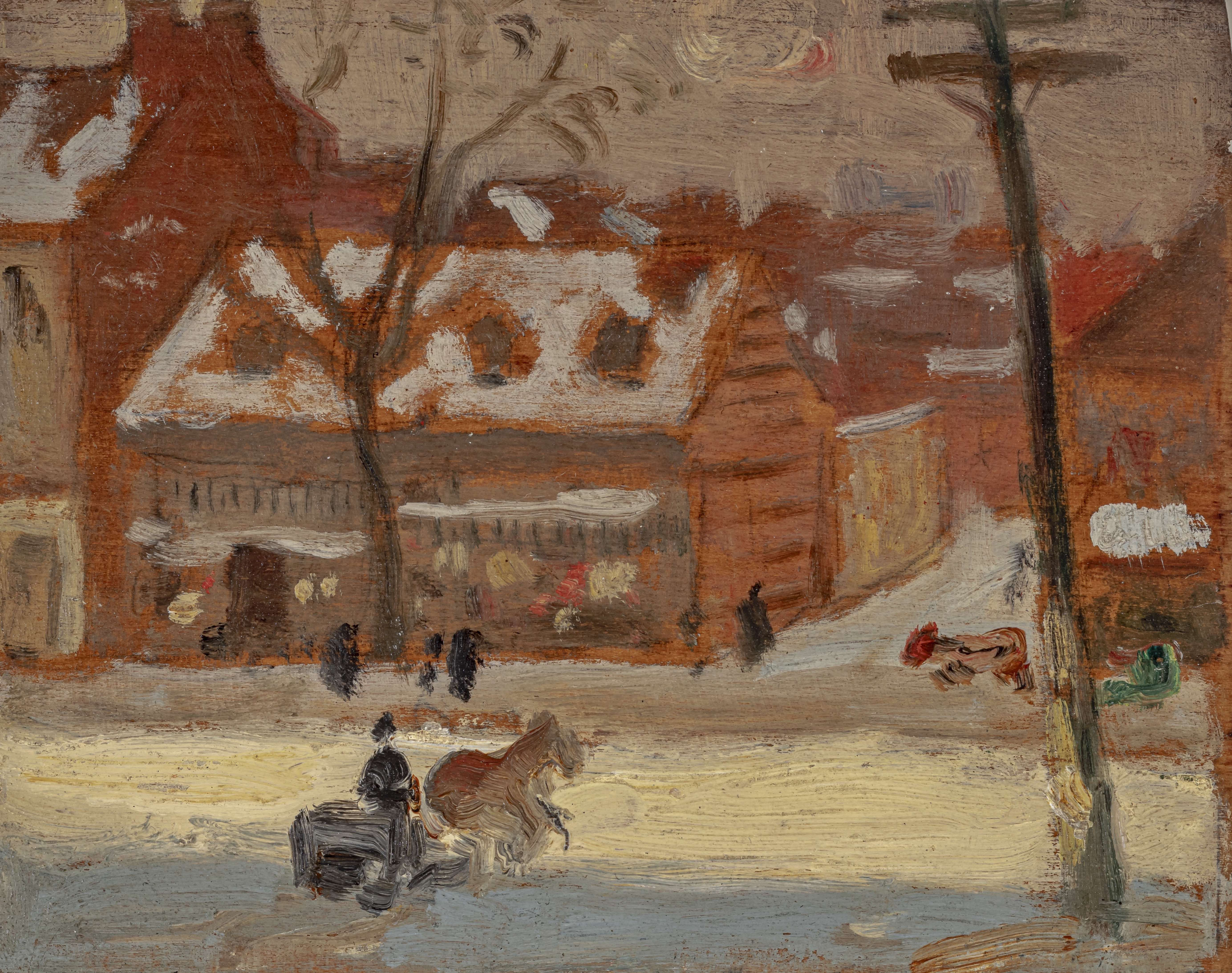 James Wilson Morrice (1865-1924), Winter Street Scene, Montreal, circa 1909-1915. Oil on panel. 4 7/8 x 6 in (12.4 x 15.2 cm). Sold by Alan Klinkhoff Gallery.