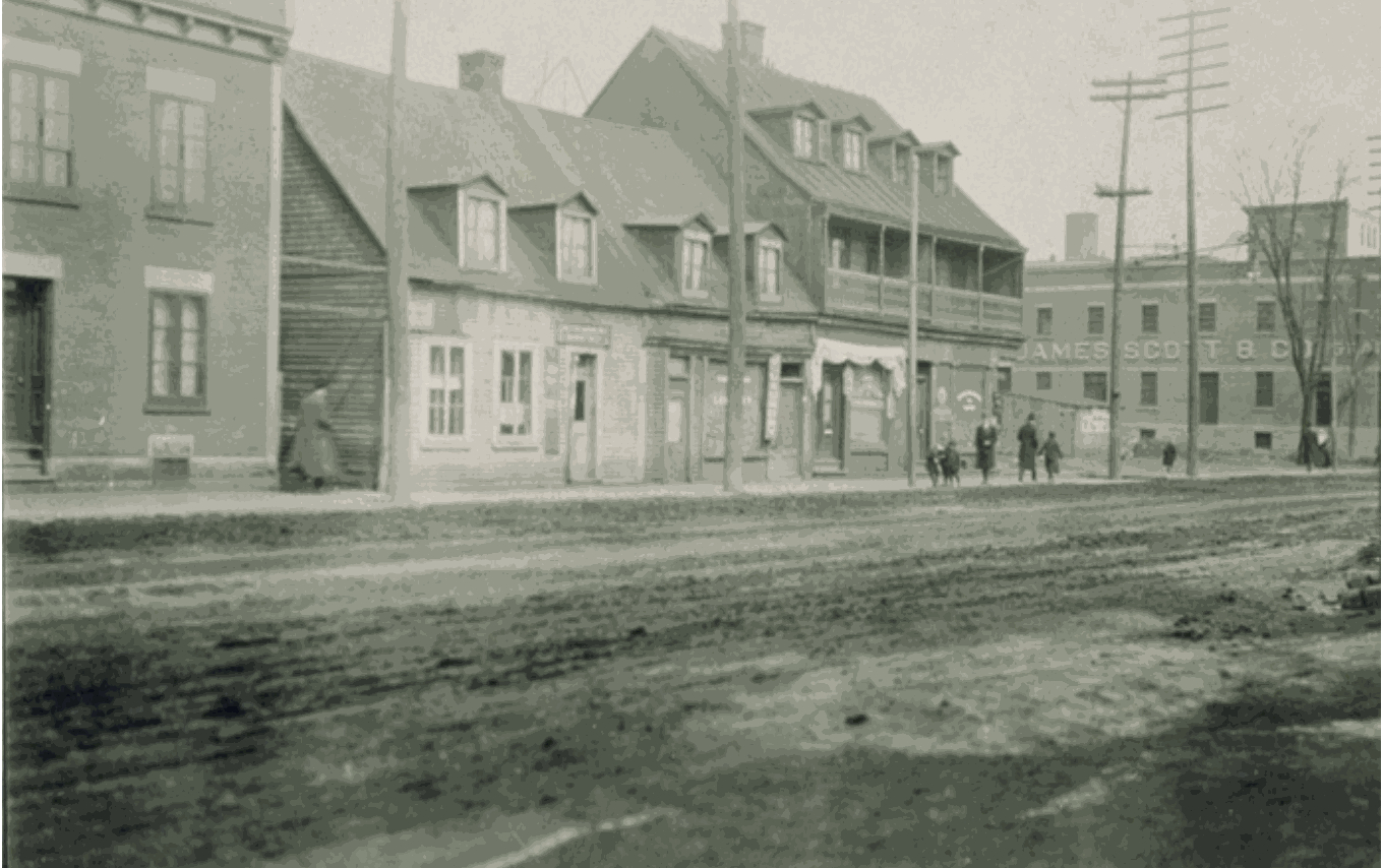Vue partielle - rue Saint-Jacques, from an unidentified magazine (after 1910). Album Edmond Massicotte, Bibliothèque et Archives nationales du Québec (http://numerique.banq.qc.ca/patrimoine/details/52327/2083716).