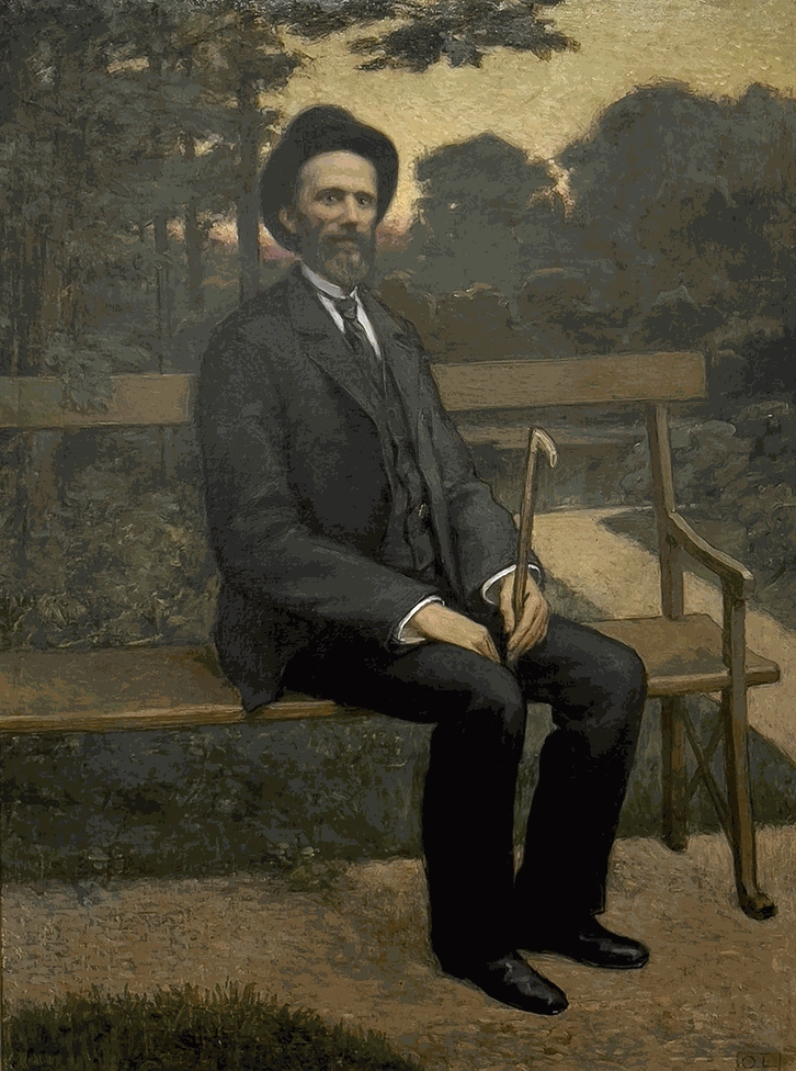 This portrait of a man sitting on a park bench represents Pierre Préfontaine (1842–1897). When the painter, Ozias Leduc, received the commission for this painting, the subject had been deceased for over 15 years. It was his daughter, Anne-Marie (1879–1959), who met with the artist and provided the photo of her father.