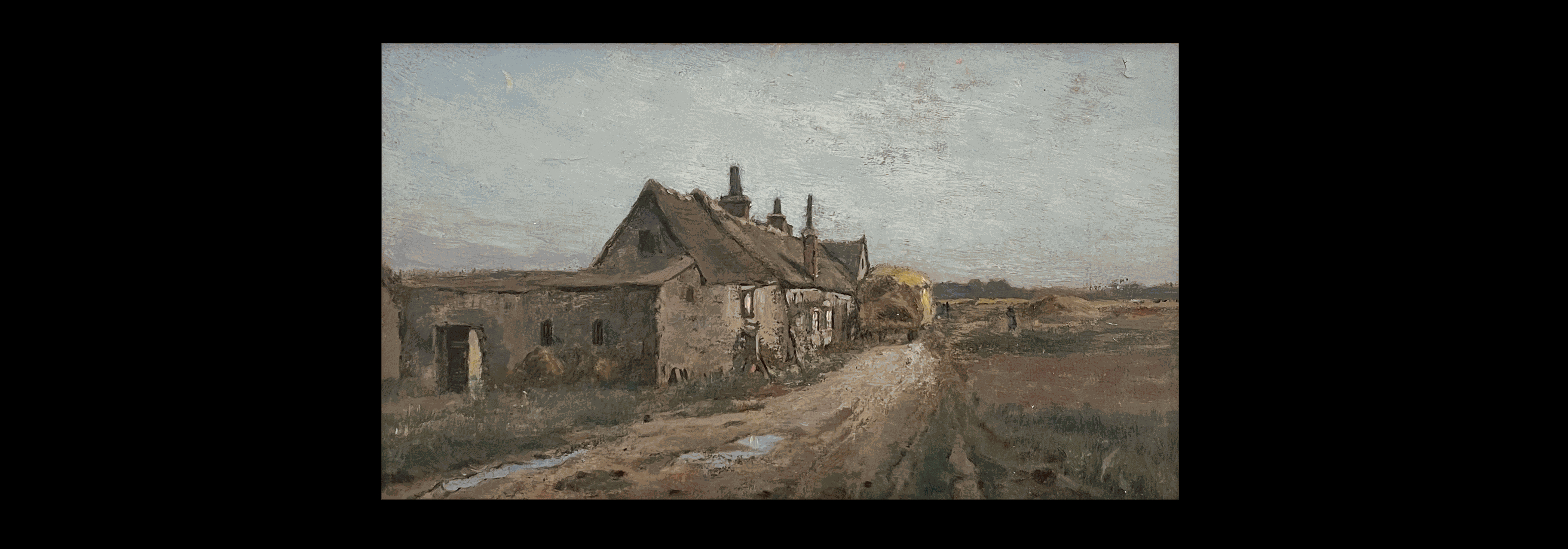Hammond’s purchasing efforts were successful—he bought dozens of artworks, particularly by British and French artists—but he also ensured that the trip included time to develop his own practice. In the 1880s, many Canadian artists considered European studies to be essential training, and Hammond was one of several who chose to go to Paris, where there were numerous opportunities for studying the academic tradition in the city’s art schools and galleries, and the French countryside, where many artists were experimenting with new approaches to landscape. Hammond was drawn to rural subjects, like the houses he depicted in Barbizon, near Millet’s Home and Studio. Dominated by soft browns and greys, this small painting has muted tones that suggest an overcast twilight, and in many respects, it is a continuation of his already established interest in atmosphere. At the same time, it is also a tribute to the influence of Jean-François Millet, one of the founders of the Barbizon School; though Millet had died in 1875, Hammond was able to meet his son (who shared the same name), and he was interested in the movement, particularly its conviction that painting the natural world required working outdoors.