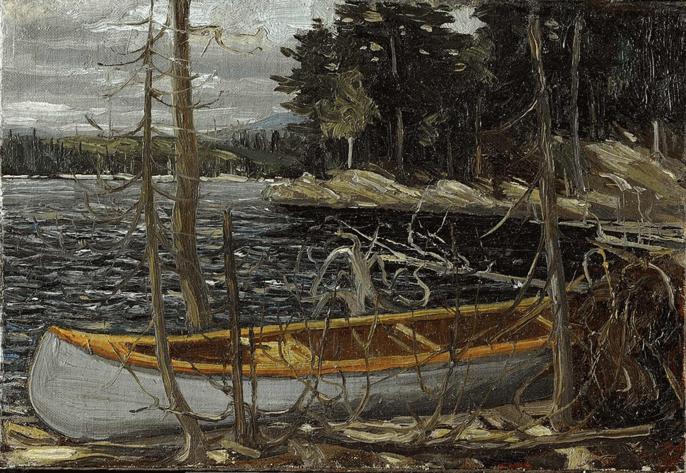 Alan Klinkhoff Gallery note: Thomson’s iconic painting, The Canoe (Art Gallery of Ontario), pictured here, is closely related stylistically to Northern Lake, 1912.