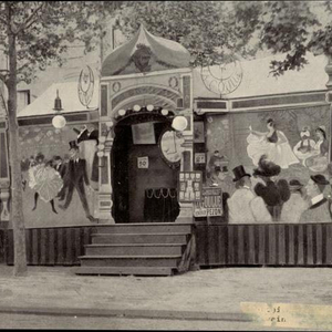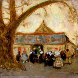 Morrice spent many months in Concarneau during the 1909-1910 season. He arrived on November 14, when the annual Foire Saint-Martin was in full swing on the quay, and a very hasty drawing of a barrack in his sketchbook betrays his excitement (Montreal Museum of Fine Arts #15, page 3). It could well be the source for the present sketch, painted later at a café table or in his hotel room.