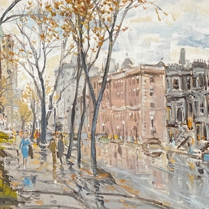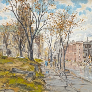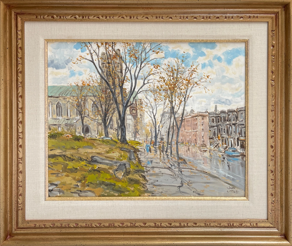 Sherbrooke St. at Simpson Looking East is an exceptional, vibrant, summer composition presenting a view now obscured by The Port Royal apartment building located at 1455 Sherbrooke St. West, directly opposite Alan Klinkhoff Gallery’s Montreal location. The painting dates from approximately the time period when the Port Royal was proposed for construction. The project to build the Port Royal, an imposing 33-storey concrete structure, was financed by the Società Generale Immobiliare, the financing arm of the Vatican.