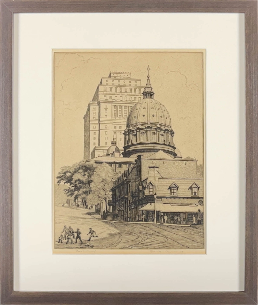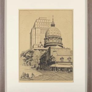 A version of this etching St. James Cathedral from the West (or St. James Cathedral, Dominion Square, Montreal), 1948 is in the permanent collection of the Musee National des Beaux-Arts de Quebec as La Cathédrale Marie-Reine-du-Monde et l'édifice de la Sun Life, 1949.