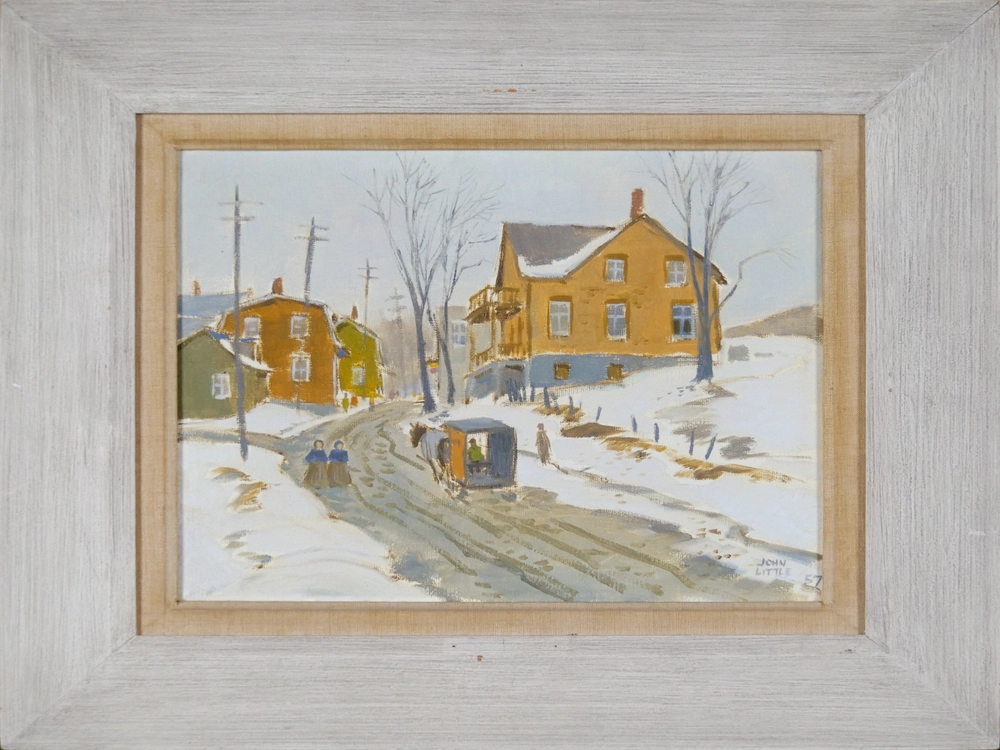 This is a rare 1950s composition inspired by a view in Levis . With an open horse drawn cart and figures which don’t appear particularly heavily dressed, one is inclined to say that this is late winter or early spring. The female figures dressed alike are probably nuns from a local convent. It was not uncommon that Little would put us in a time and a place with dress of the period and customs he wanted to preserve.
