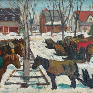 Kathleen Morris was accompanied by her mother on these winter sketching trips to towns and villages like Berthierville where she painted these important compositions featuring calèches, churches, and horses. Here, Morris’s energetic brushwork captures the unassuming resplendence of the hitching posts opposite to the Berthierville church and are a testament to her preferred subject matter. Morris herself commented, “I don’t think I showed any evidence of talent until I started drawing horses all over my schoolbooks [sic] ... I love to paint animals.”