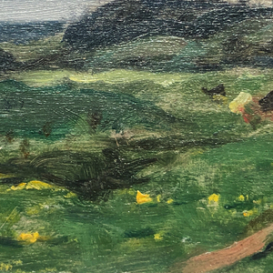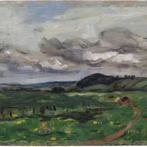 Paris, Venice, Brittany, then exotic places in North Africa or the West Indies: these were “painting places”, what we expect to see. Often a town, big or small, but never far from the water; so such a simple, pure landscape is rather rare, except for the early years of his career. In spite of its small dimensions, the view encompasses a wide panorama, made even wider by the importance given to the sky and the clouds. We are in a grassy meadow; the path (or the road?) loosely follows a stream (or a river?), towards a big hill (or a mountain?). There are some colour patches near the water in the middle ground: animals drinking in the water, or small houses in a hamlet? The only elements that could give us a certain sense of the scale are the fence at left, and the yellow flowers at our feet.
