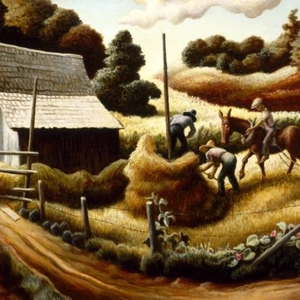 [...] In Haystack, the spiraling motion implicit in the hay coiled on the central pole is echoed throughout the painting, where content and artistic process meld seamlessly as Benton weaves together sky, earth, and farmer into one holistic vision of rural life in Missouri."