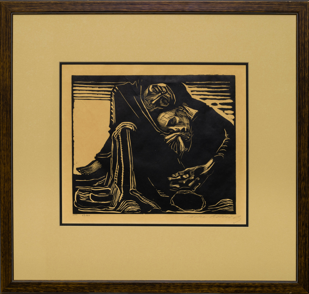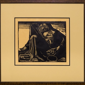 The suicide of Käthe Kollwitz’ cousin Else Rautenberg in 1920 is, according to a diary entry, “the saddest event” for the artist in that year. Her exploration of this incident is reflected in this woodcut from 1921. The interpretation of death is given a completely new aspect in this work. Death is not depicted as a power that grips living beings in order to destroy them, but as a force that gives refuge to a person who – maybe after a long and painful struggle – has arrived at Death’s door. Shrouded in a wide cloak and held by Death’s strong hand, the dead woman can rest and find peace in his lap. Her head rests on his breast and her open mouth conveys the image of a final exhalation, of being allowed to let go. This image is underlined by the woman’s wooden shoes that have been removed (bottom left). A thin crown of thorns lies on the floor in front of the crouching figure. Death, with a solemn and benign expression on his face, has lowered his head almost affectionately to hers and sits contemplating and keeping watch. The symbol of the crown of thorns is a reference to Christ who, although innocent, was beaten and mocked, but did not defend himself.