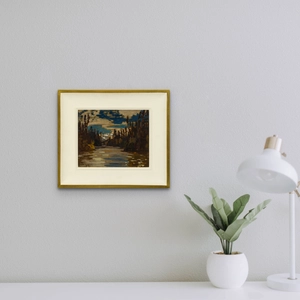 Harris’ sketch served as the basis for a canvas in which he enhanced the sculptural forms of the trees but opened up the stream at the focal point, lightening the distant trees, visually bringing them forward. The canvas retains the sombre silence of the sketch.