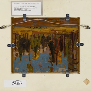 Jackson used the back of his panel to start a composition of trees by the water’s edge that is very similar to his oil sketch A Beaver Lake, dated 1921, and sold at Heffel’s, 28 November 2009, lot 309, and Beaver Lake, Algoma in the McMichael Canadian Art Collection (1968.8.20).