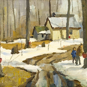signed, ‘TOM ROBERTS’ (lower right); inscribed, signed and titled, ‘ TO PALL STEIER/ TOM ROBERTS A.R.C.A. O.S.A/ “THE MAPLE BUSH” YORK COUNTY (DUFFERIN ST)./ MARCH 1966’ (verso, upper right)Provenance