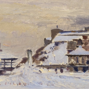 The first Dufferin Terrace slide was built in 1884 and made permanent in 1946. The Château Frontenac skating rink, located on the edge of the promenade, was, for a long time, one of the capital’s most popular rinks.[2] From 1948 onwards, Pilot devoted himself to these scenes of winter fun on the terrace. In the 1950s, he exhibited six eloquently titled paintings on this theme at the AAM and the RCA. In 1955, the Montreal Arts Club presented a painting titled The Terrace Quebec – Twilight [3] to Sir Winston Churchill for his 80th birthday.