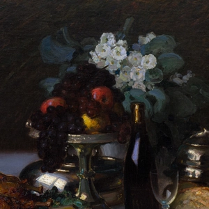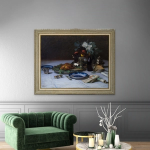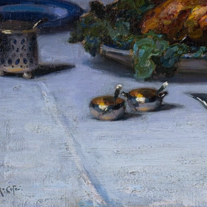 This splendid version is the finest execution of the theme. Although the chicken is the main course, Suzor-Coté added unique dimension to each of the accessories that make up the scene. The dish is surrounded by a magnificent still life of white primroses, apples and grapes on a raised fruit platter. The place setting of blue and white porcelain and fine silverware is complemented by silver containers for salt, pepper, mustard, vegetables and bread. The rich reflections bring some light to this lavish table, complete with a bottle of wine and a glass.