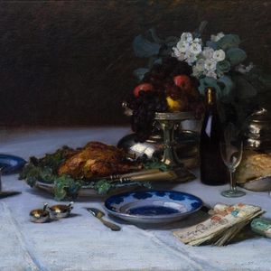 On the right side of the foreground, a napkin, newspaper, and letter addressed to the artist are displayed on the finely pleated white tablecloth. This work depicts a meal that the artist prepared for himself, using the richness of the table and a wide range of saturated colours to emphasize the quality of the food and service. The rich chromatic palette and smooth brushwork make this composition a visual feast. Suzor-Coté proved to be a master at rendering matter and light.