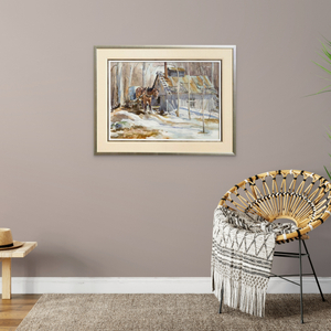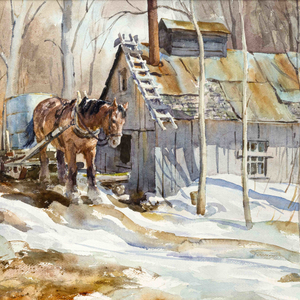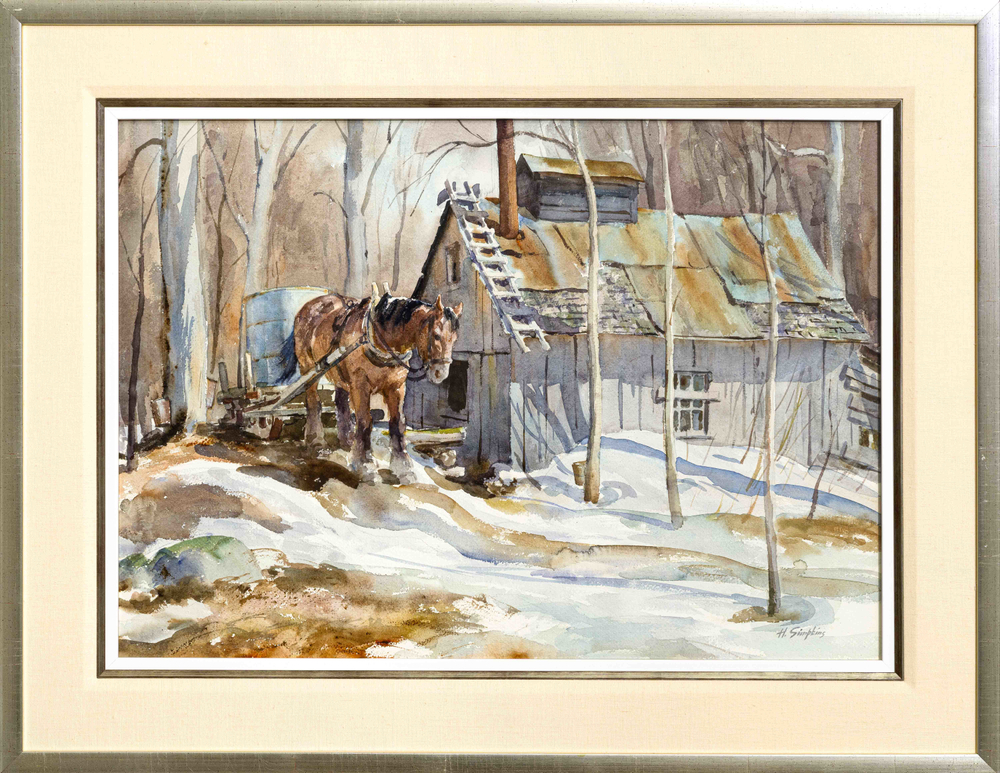 Henry J. SimpkinsSugar Camp - Cabane à sucre1906-1995Watercolour - Aquarelle20 1/2 x 29 1/2 inThis artwork is presently on view at our Montreal gallery