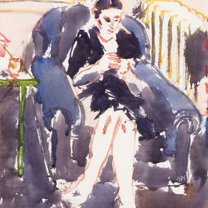 While these are not large paintings in any sense, they participate significantly in an important art historical category with which Milne was familiar from his time in New York City: the approach known as ‘Intimism.’ Best appreciated in the work of late 19th - to early 20th-century French painters Pierre Bonnard and Edouard Vuillard, Intimism represented seemingly every day domestic interiors, very often focused on a lone female sitter involved in domestic duties or reading. In Vuillard’s paintings especially, decorative motifs such as floral wallpaper would often seem to overwhelm if not quite dissolve these human protagonists. Milne had painted several such scenes of Patsy in New York, c. 1913-14. Both watercolours and oils, these include Striped Dress, Red, and The Yellow Rocker. These two paintings of Kathleen Pavey from 1940s are much simpler and more immediate than the New York paintings, yet they also share many of the concerns, qualities, and pleasures of Milne’s early essays in Intimism.