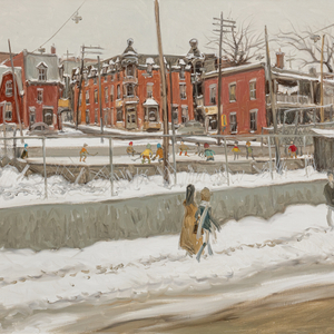 — This is a real time capsule in terms of activity, buildings and dress. There can be few better slices of urban life that have for the most part disappeared due first to the suburbanisation of cities and then the regeneration of the urban core when urban planners recognised their folly. Extraordinarily, however, with the building of a community school on the block featured in Little’s painting, there exists today a large playground where the rink is featured.