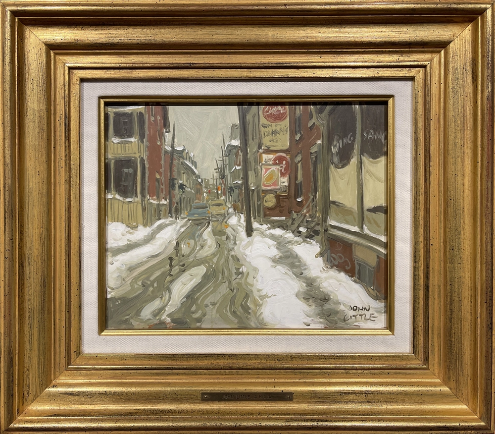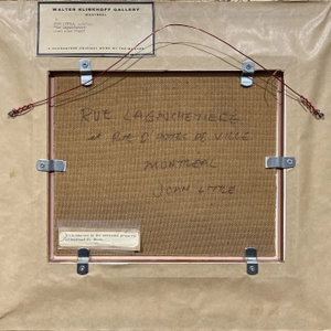 signed, 'JOHN/LITTLE' (lower right); titled and signed by the artist, 'RUE LAGAUCHETIERE [sic] / et RUE D'HOTEL DE VILLE / MONTRÉAL / JOHN LITTLE' (verso, centre)Provenance