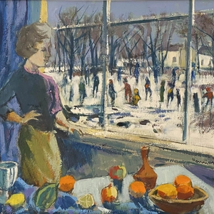 “Studio Window” of 1970 is an outstanding example of Henri Masson’s painting, combining his interest in still life, the human figure and Canadian landscape. It is reasonable to speculate that his wife Germaine served as the model and to offer the perspective and relationship of scale in the composition. Henri was a bold presence in person, an artist who was a passionate supporter of a Canadian form of expression in painting. He enjoyed an extensive and successful career, collected by the foremost collectors and museums of his day, including John A. McAulay, H.S. Southam, The National Gallery of Canada and the Hirshhorn Museum.