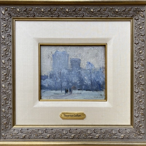 The composition Maurice Cullen offers here is a view looking across Montreal’s Dominion Square. Montrealers are captured on a cold winter’s evening walking through the square and with a characteristic cab stand, horse-drawn cabs and warming hut for the coachmen implied, defining the west end of the Square at Peel Street. The square is and was hardly a 10-minute walk up from his studio on Beaver Hall Square. It is precisely at this juncture that Maurice Cullen achieved some of his finest Montreal urban scenes in his impressionist technique. Whether Cullen was invigorated by his recent marriage to the widowed Barbara Merchant Pilot and the relocation of his new family from Newfoundland to Montreal around this time is a convenient hypothesis to explain the strength of this vintage of his painting in the city.