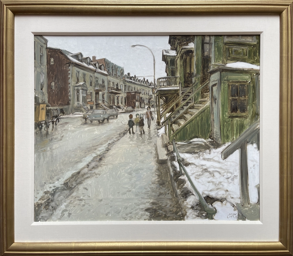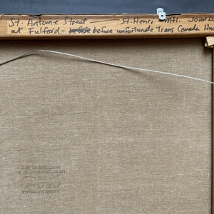 signed, 'JOHN LITTLE' (lower right); titled, inscribed, signed and dated, 'St. Antoine Street/ at Fulford - St. Henri - Mtl/ before unfortunate Trans Canada Hway/ JOHN LITTLE '72' (verso, upper horizontal stretcher)Provenance
