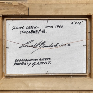 signed, 'Lorne H. Bouchard' (lower right); sized, titled, dated and signed, '8" x 12" / Spring Creek / St-Fereole [sic] P.Q. / April 1966 / Lorne H. Bouchard - R.C.A.' (verso)Provenance