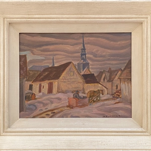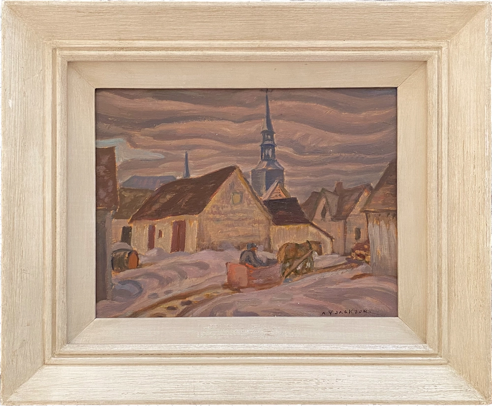 In spite of his complaints the village of Cacouna Jackson painted in 1935 appears to have changed little since 1921. As in his earlier paintings of Les Éboulements and Baie-Saint-Paul, the sheds and houses are closely clustered around the central church creating a feeling of intimacy in his depiction of the village. Two horse drawn sleighs, one carrying logs, the other a passenger, occupy a road that cuts into the composition from the lower left, past a leaning barn and wooden barrel and disappearing between the sheds centre right. The centre of the composition is defined by the peaked roofs and church spires that pierce the grey, rolling clouds.