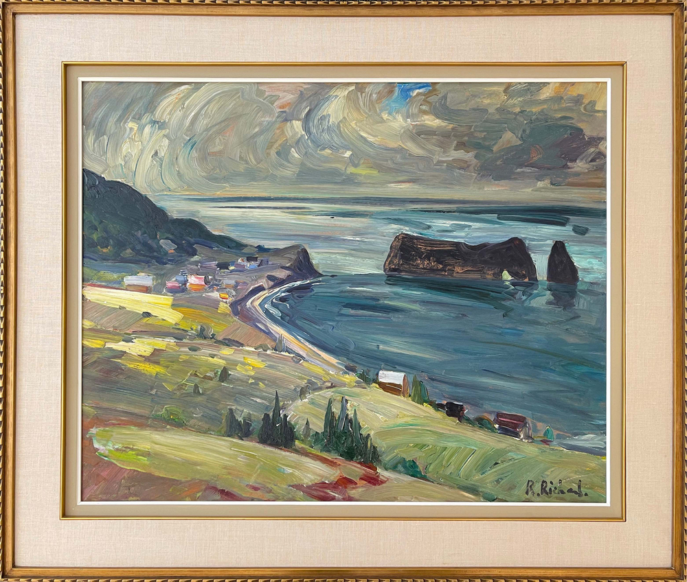 Heffel Fine Art Auction House.The effect of the setting sun on his landscape and the rolling clouds above at Percé Rock in the Gaspé served to inspire Richard to great heights in this composition. Richard has perched himself somewhere above Cap Blanc it seems and was looking northward towards the Percé Rock, or more importantly for the artist, toward the setting sun and the artistry it suggested to him.