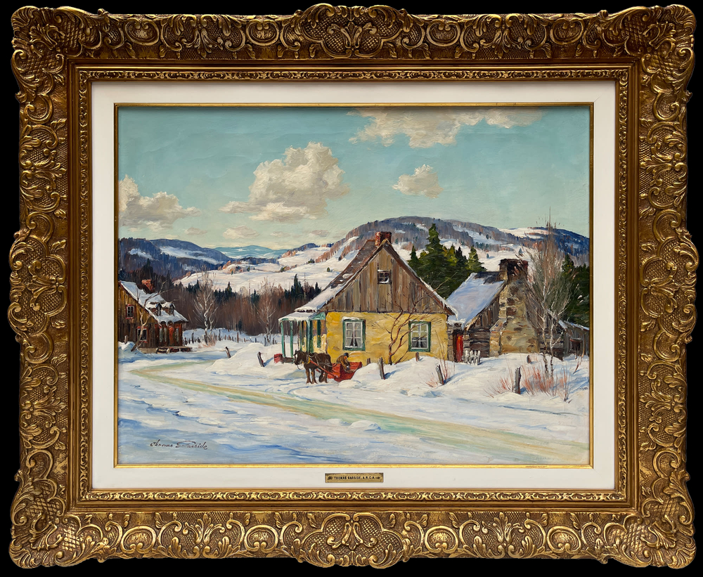 In a previous exhibition and sale we offered an equally exceptional painting by Thomas Garside at Métis-sur-Mer, a popular area in the Gaspé populated in the summer months by affluent people from Montreal and elsewhere. In this fine canvas Garside is on the other side of the St Lawrence River, the north shore, and in winter. Murray Bay, like Metis has a legacy of affluent summer “residents” from Montreal and farther afield dating, for all intents and purposes, to the beginning of the 20th Century. The American President, William Howard Taft had a home in Murray Bay. (Descendants of the President had 4 homes in the area through the 1960s). Murray Bay was a stop for the prestigious White Ships “in the day” and the Manoir Richelieu Hotel was the anchor for short term visitors.
