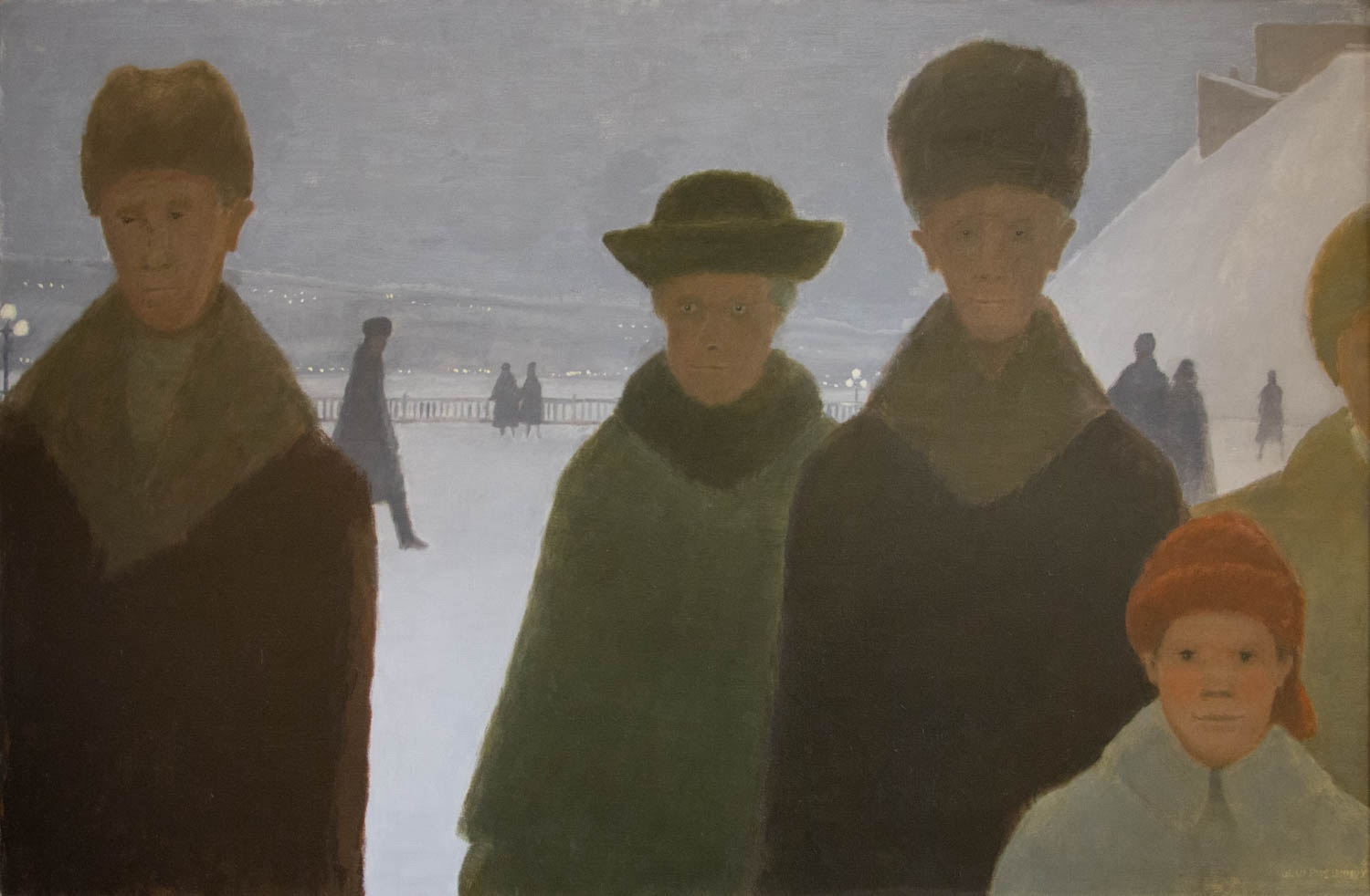 Finally, it is noticeable that the Lemieux’s palette is strictly control. The winter coats of the two men and of the two women look alike in their form but also by their colors, darker for the men, paler for the women. Only the bright face of the boy, and the red of his hat add an element in contrast. This parsimony of colors is a powerful mean of integration of the personages in the surface of the painting. One forgets the setting and get interested in these strange “visitors” for themselves, like Lemieux call them in other similar paintings.