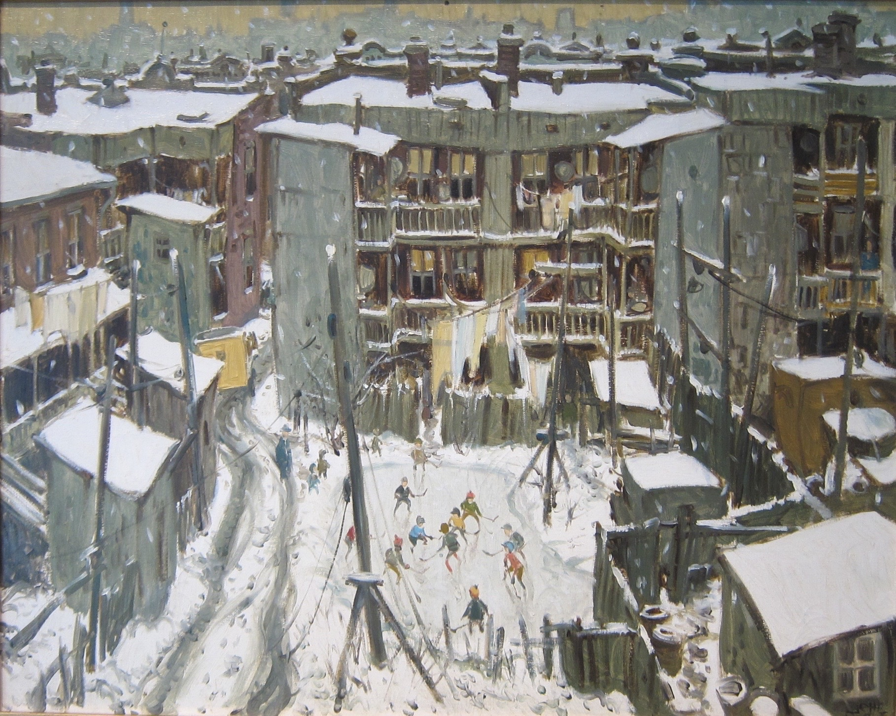 Bien que les tableaux de Little soient particulièrement appréciés pour leurs qualités picturales, ils représentent beaucoup, beaucoup plus que cela. En jetant un coup d'oeil rapide à sa scène de hockey de ruelle dans Faubourg à M'Lasse, Dorion Street (1965), nombreux sont ceux qui feraient l'éloge du bonheur visuel qu'elle suscite. Quel plaisir s'en dégage! Toutefois, derrière ce tableau se cache l'histoire de ce quartier, très précisement, qui a été rasé suivant un ordre d'expropriation, entraînant l'expulsion de 5000 citoyens et la démolition de 12 épiceries, de 13 restaurants et d'une vingtaine de manufactures. Cette peinture se charge donc d'une tout autre dimension. Voilà une caractéristique distinctive de son oeuvre, dont Little n'a pratiquement jamais parlé, sinon au moyen de ses toiles. Nous pouvons donc aujourd'hui apprécier l'essence même du Faubourg à m'lasse par l'intermédiaire de trois tableaux majeurs de l'exposition, dans lesquels Little lui rend hommage. Grâce à Little, le quartier et son précieux héritage font partie à jamais de « l'album de famille ».