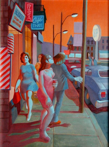 End of Summer is a generational painting and perhaps Surrey’s most important painting of this vintage. This painting served as the cover image on the catalogue of the Philip Surrey Retrospective Exhibition, September 18 - October 2, 2004, hosted at Galerie Walter Klinkhoff. The location is somewhat recognizable. The artist has located himself on Fairmont at Jeanne-Mance, looking West with a slice of Mount Royal in the distance. As is characteristic of some of the best of Philip Surrey, he is working with the mystery of evening, his subject illuminated by electric light. He is an avid painter of youth, customarily full figured. His use of stripe patterns on the clothing serves to accentuate their forms. This is a neighbourhood scene in Montreal’s Mile End borough, one with mixed roots in origins including Greek, Italian, Jewish and Portuguese. One notes a predominance of geometric forms - squares, circles, rectangles - in his design.