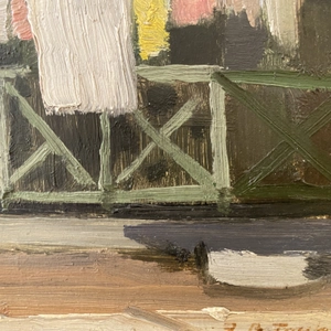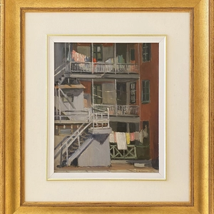 Taylor’s interest in back galleries dates at least to the mid-1930s in his days when he was primarily working in etching. This subject sporadically resurfaces in etching and later in his oil paintings. Harvest of Mammon of 1948, likely politically charged, an aquatint, is perhaps the most famous of the multiples. It is not incidental that Taylor has sought out for composition a modest, working class property, the kind which only a few years after the date of his paintings was subject to the wrecker’s ball through expropriation under the guise of urban renewal. Taylor painted a large canvas measuring 30” x 24” which Galerie Walter Klinkhoff sold more than 30 years ago.