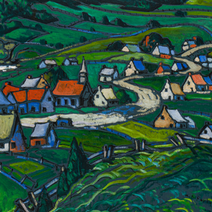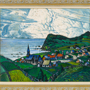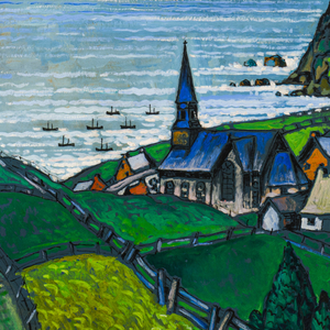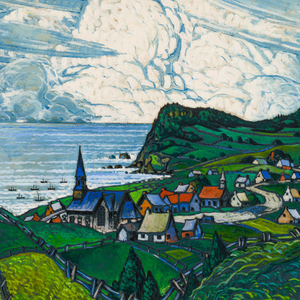 In contrast to other known versions, this artwork—painted on a grey background—is distinguished by the demarcation of two equivalent chromatic zones. The green mass of the coastline is balanced out by the blue of the sky and the sea, creating an effect of stability. The relatively calm sea and the orderly arrangement of seven cod fishing schooners anchored in the cove contribute to this effect. However, nothing is permanent in a painting by Marc-Aurèle Fortin. Upon observing this stability, the peaceful feeling disappears, only to be replaced by the turbulent movement of the heavily clouded sky. The feeling is transformed once again when looking at the town and the farmland, which form a vivid pattern of saturated colours. The bold strokes that outline the motifs are typical of Fortin’s more blunt style, which he adopted in the 1940s. The town of Anse-aux-Gascons is easily recognizable, with the spires of the Catholic and Anglican churches rising above the small houses with sloped roofs. But beyond the depiction of the town, Fortin shows us a harmony of pictorial effects that bring together humanity and the raw forces of Canadian nature.